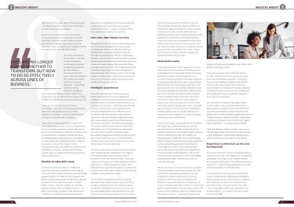 The institutions that lead will be those that build for adaptability, deploying technologies with purpose, solving real customer problems, with architecting experiences that evolve with the market. The good news? The tools – like composable DXPs, low-code platforms and AI engines – are finally catching up with the ambition. x www. intelligentcxo. com